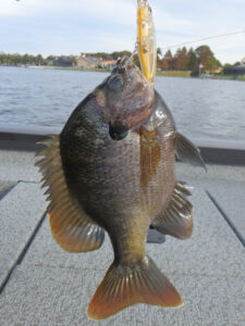 時間があまりない事もあり、前回デカいのをバラしたポイントに直行します。はじめは様子見でリップレスを投げていると、元気の良い1lbクラスがヒット。リップレスで釣れたのは久しぶりのような気がします。